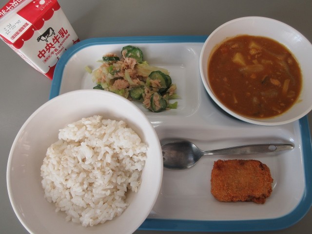 初日の今日は、麦ご飯、チキンカレー、とんかつ、ツナサラダ、牛乳でした。そして、今日は小学6年生と中学3年生に「いちごミルクジェラート」が出ました。