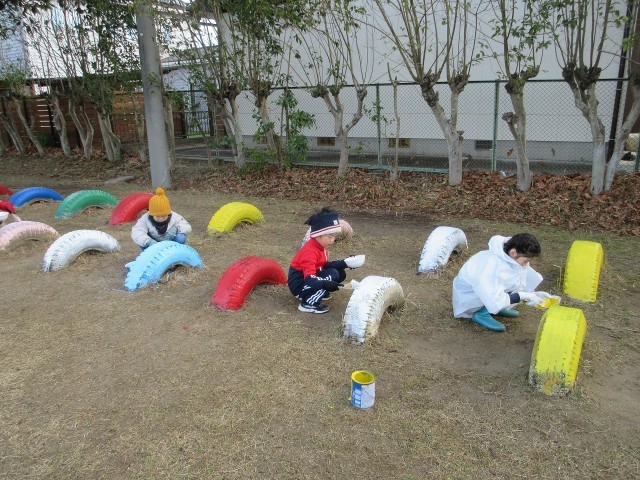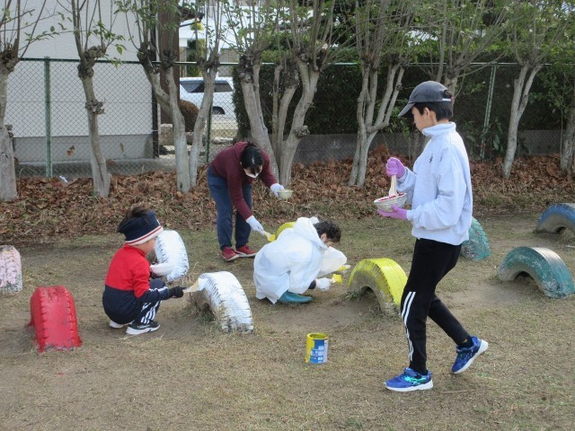 ふきっ子サポータズによる環境整備活動がありました。今日の作業は、運動場の遊具等のペンキ塗りと木の剪定です。タイヤなどの遊具が色あせていたところをペンキで塗ってくれました。今日の作業には、サポーターズだけでなく、ふきっ子、そしてもうすぐふきっ子として入学する子どもたちが参加してくれました。