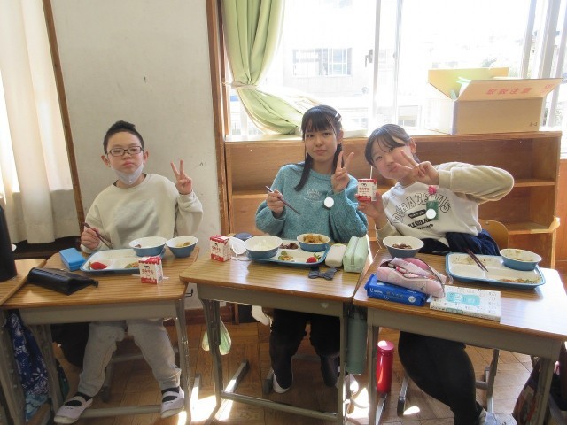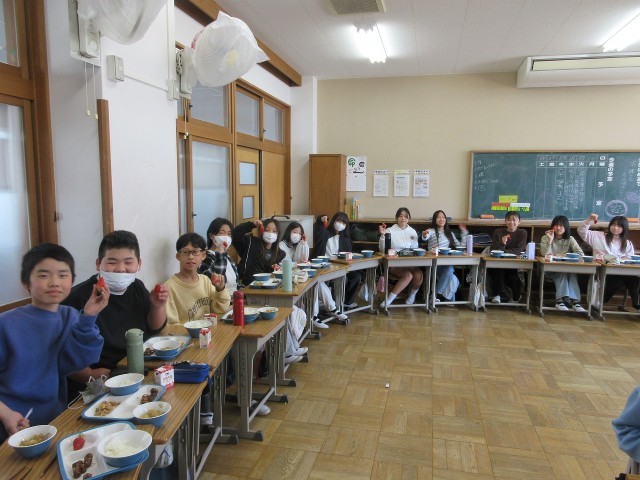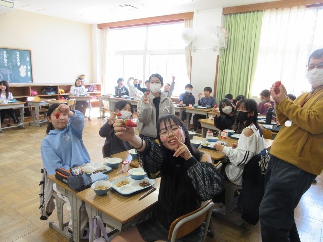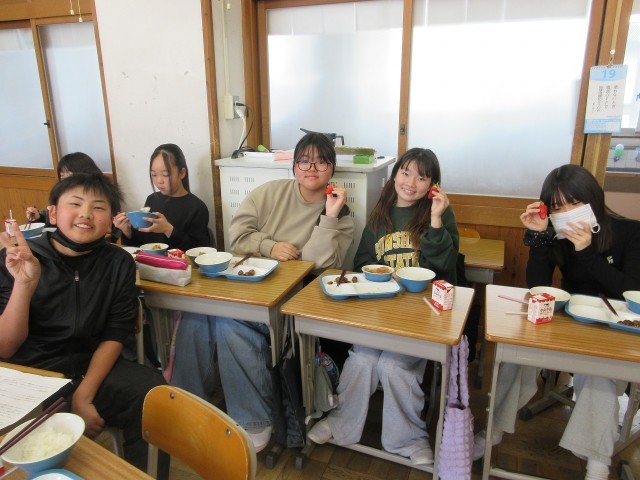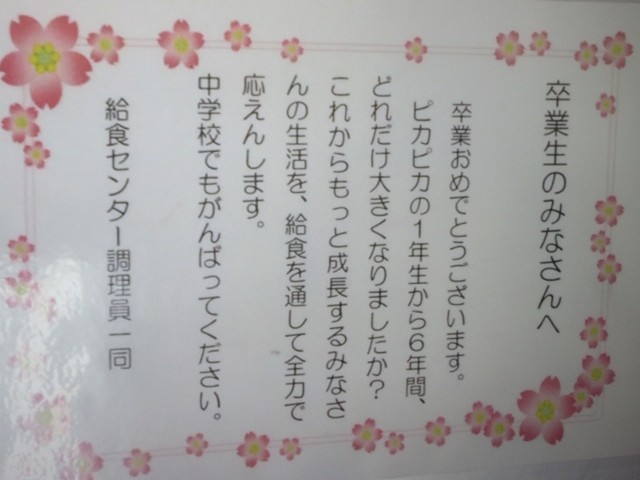 6年生は、今日が給食最終日でした。6年生にだけ、「たけとよいちご」が出ました。6年生ふきっ子は大喜び!でした。また、給食センター調理員の皆様から、6年生へ温かなメッセージも添えられていました。そのメッセージを電子黒板に写し、読みながら給食を食べました。給食センター調理員の皆様、ありがとうございました。