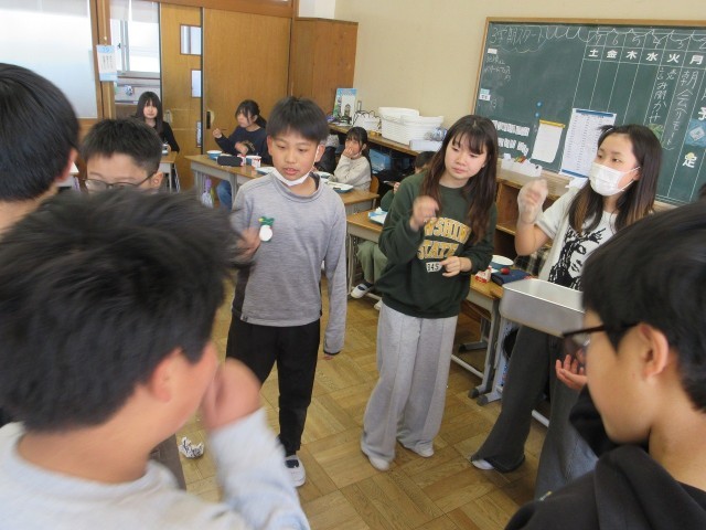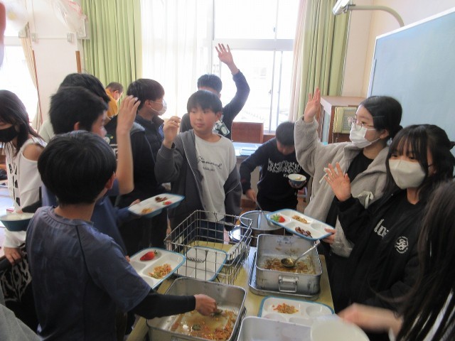 給食の時間に教室をのぞくと、給食じゃんけんの大きな声が響く6年生。1組、2組ともに、今日もお約束の給食じゃんけんが行われていました。