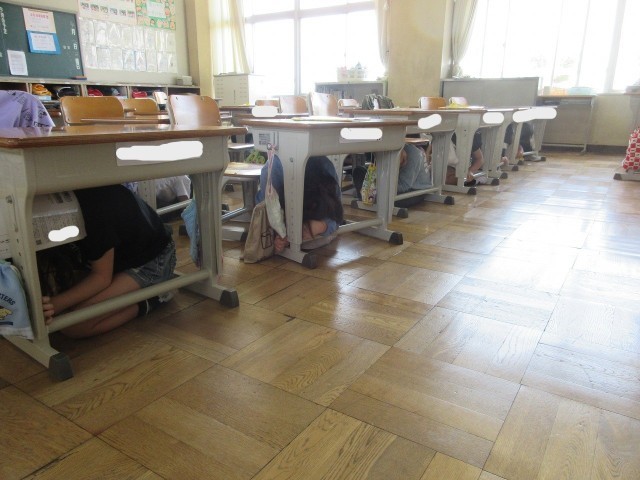2時間目に地震避難訓練を行いました。今回の訓練では、授業中の地震発生に、音響機器が使用できない場面を想定した訓練でした。