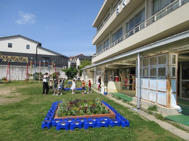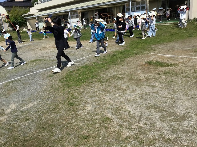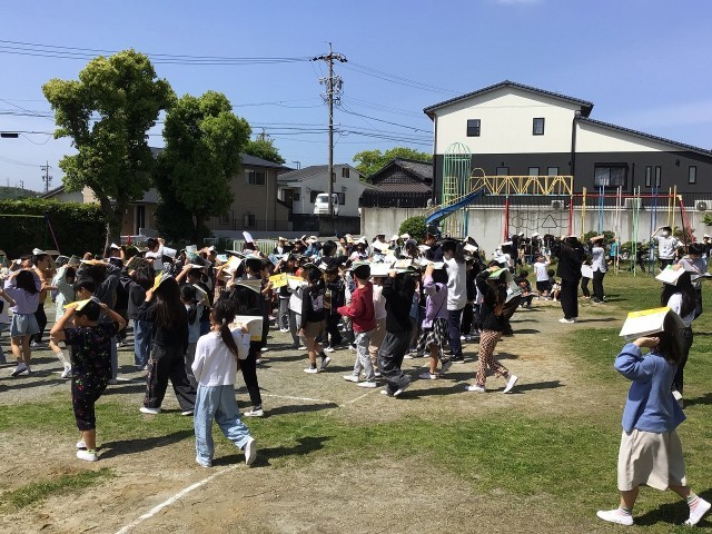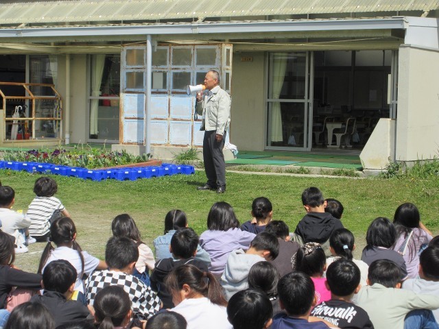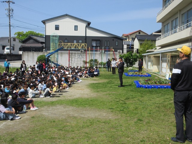 子どもたちは、すぐに第1次避難(シェイクアウト)を行いました。その後、拡声器で避難を呼びかける先生の指示で静かに前庭へ避難しました。今日の訓練には、武豊町の防災交通課の方と防災専門官の方が見に来てくださいました。有事の際に備えて、子どもたちは真剣に訓練を行うことができました。