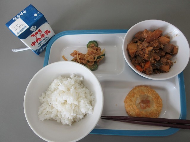 今日は「愛知を食べる学校給食の日」でした。そんな今日の献立は、ご飯、みそたろうコロッケ、豚肉と根菜の味噌煮、切り干し大根のたまり醤油和え、牛乳でした。