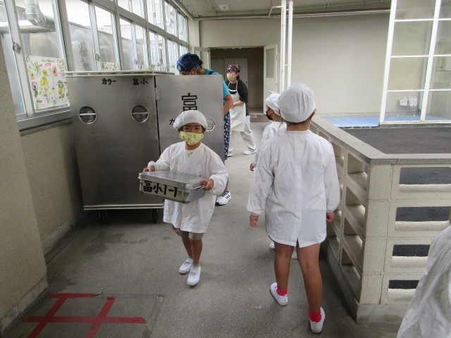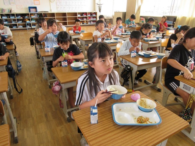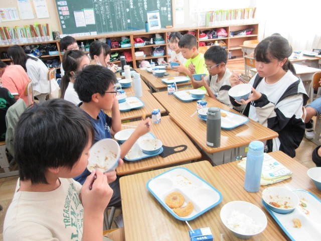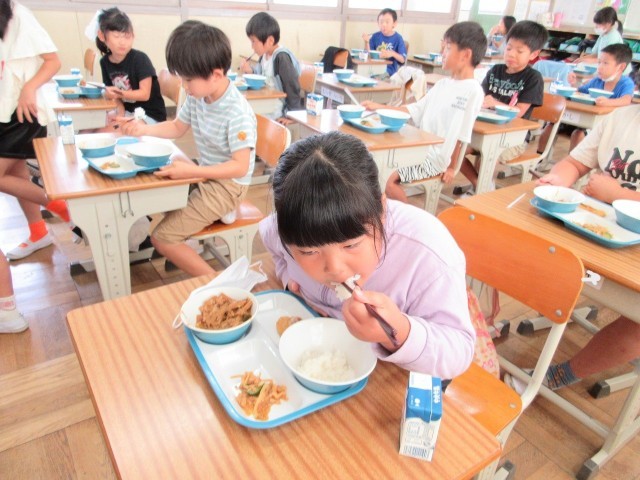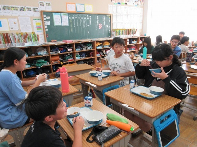 今日のご飯は、富貴小学区にお住まいの生産者さんが心を込めて育てたお米(コシヒカリ)が使われていました。子どもたちは「ご飯が甘い!」「ご飯が光ってる!」「おいしい!」と嬉しそうに食べていました。「切り干し大根のたまり醤油和え」のたまり醤油も「豚肉と根菜の味噌煮」の味噌も武豊町産でした。地元の恵みに感謝して美味しくいただきました。