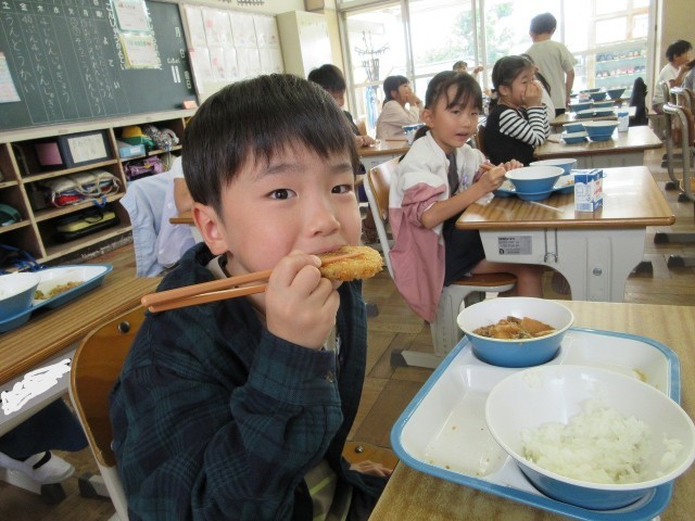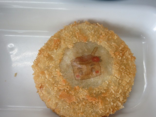 「みそたろうコロッケ」は、コロッケの真ん中に「みそたろう」がプリントされていました。「みそたろうの部分、もったいなくて食べられない」と言っている子がいっぱいでした。中には、コロッケの端を食べて、みそたろうの部分だけを残して眺めている子もいました。