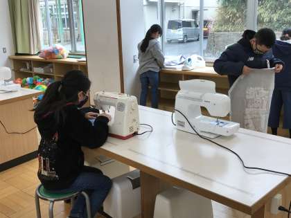 ミシンを活用したりアイロンがけしたりしてオリジナル作品を制作中でした。
