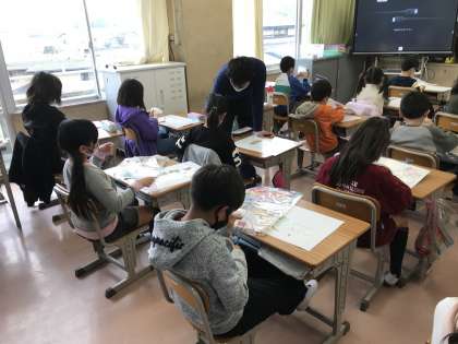教科書を読む姿勢がすばらしい。隣の教室では,プチプチを使った工作とそろばんの授業が行われていました。