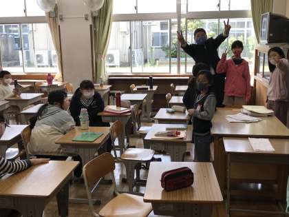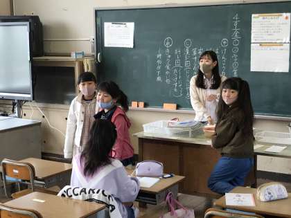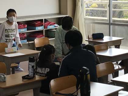 担任のそばにふきっ子がいます。微笑ましい光景です。