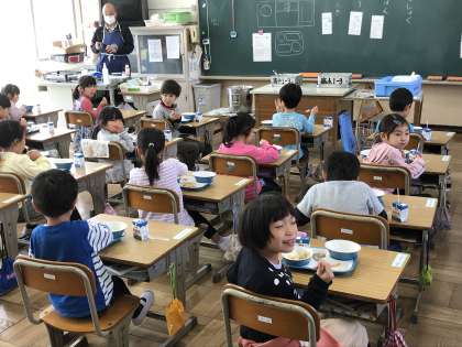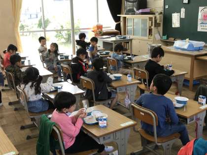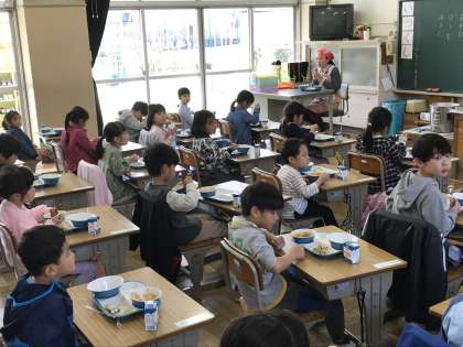 どの学級も前向き給食を行っていました。ただ,カメラマンが教室に入ると,ついついこちらを向いてしまいました。