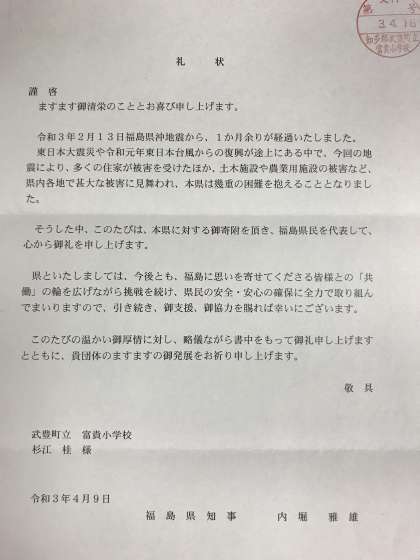 昨年度末,3年生(現4年生)を中心に行った福島県沖地震への募金活動に対して,福島県知事から学校に礼状と受領証明書が届きました。一日も早い復興を祈ります。