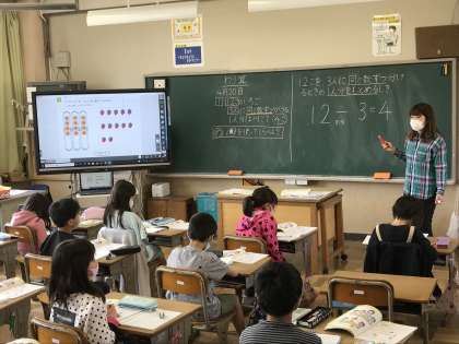 国語では,場面ごとの内容を確認していました。算数では,プリントの問題に取り組んだり,わり算の式を復唱したりしていました。