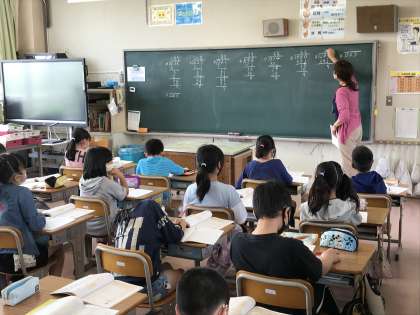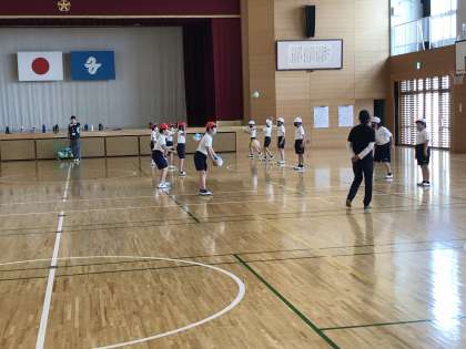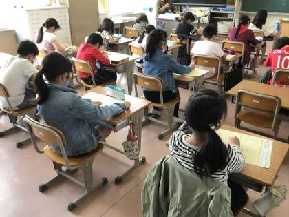 わり算の問題に取り組んだりテストに集中したり,間隔を空けたボール運動に取り組んだりしていました。