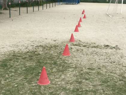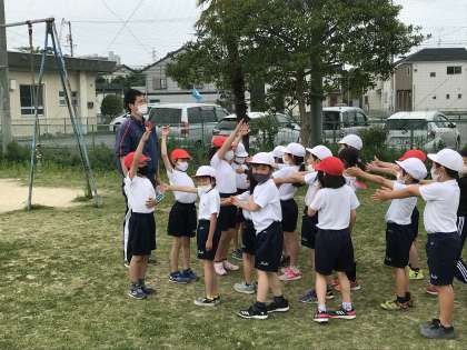 最後の整列の場面でした。鉄棒の実技練習の際には,カラーコーンを置き,目で見て児童間の距離が確認できる工夫がされていました。