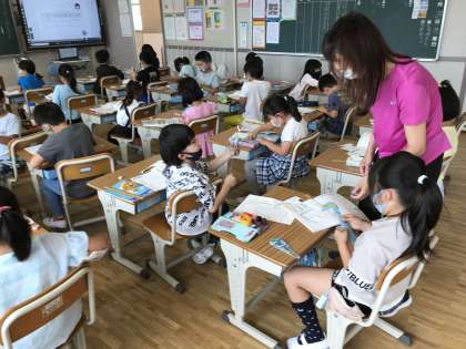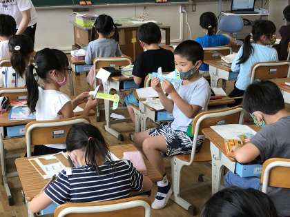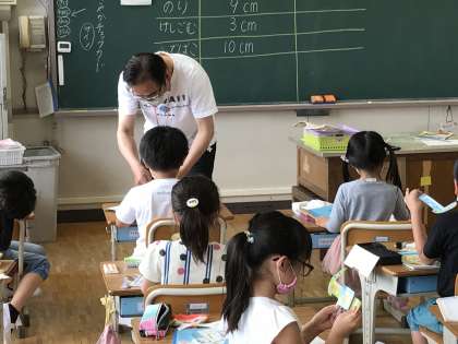 算数の授業で,手作りのものさしを楽しそうに作っていました。