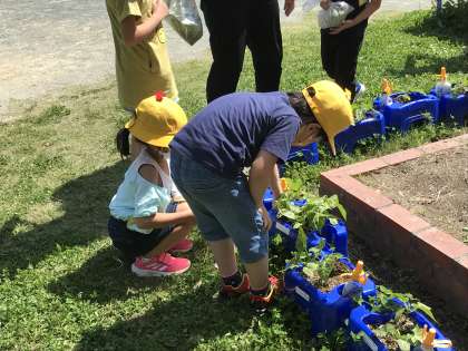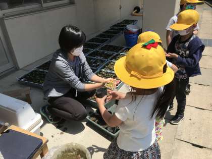 葉の収集を行ったりポットに土を盛ったりしていました。