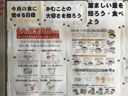 今月は,食育月間です。子どもたちに興味・関心をもってもらうために,掲示を工夫して取り組んでいます。