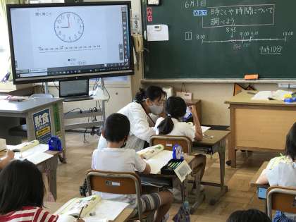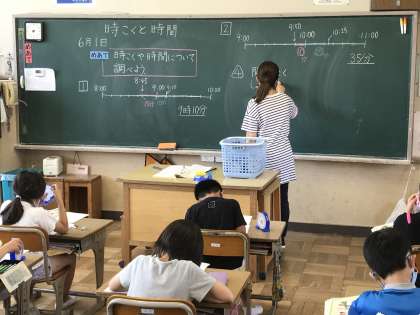 めあてを「時刻や時間について調べよう」とし,数直線上に表す学習に取り組んでいました。