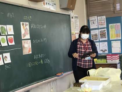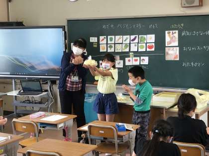 栄養教諭の宮本先生による授業が行われていました。めざせ!ベジモンマスターと題して,楽しそうに学習していました。