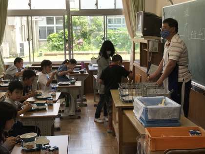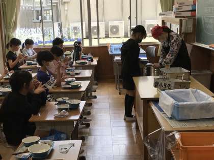 前向き給食が定着しています。お替りする子もいて,残菜削減に貢献しています。