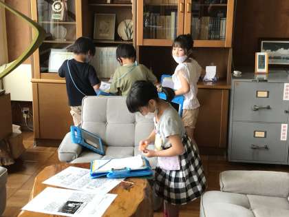 学校探検をしながら,班ごとにスタンプラリーをしたり「いいね」写真を撮影したりしていました。