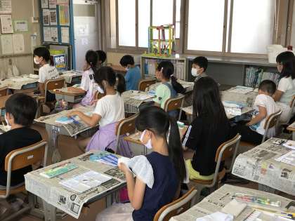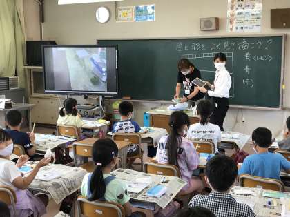 図工の授業が行われていました。教育実習生も活用し,絵の具の使い方について確認していました。