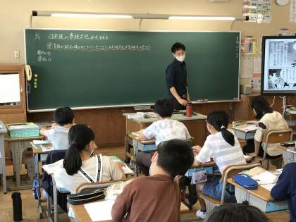 教科分担制による社会科・国語科の授業が行われていました。国語科では「伝わるシート」を活用し考えをまとめていました。社会科では,日本風の貴族文化について学習していました。