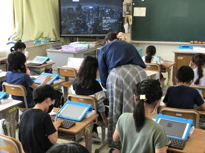 1組同様,ICT支援員を活用し,タブレット端末にキーボードを接続して学習に取り組んでいました。