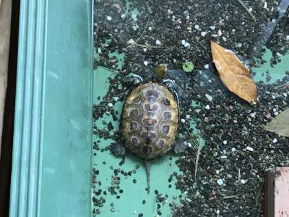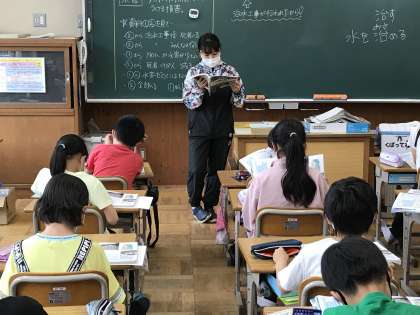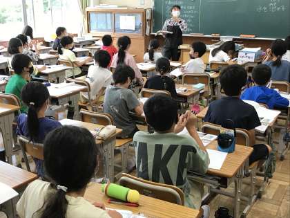 社会科の授業が行われていました。資料から読み取り,意見交流していました。クラスで飼育しているカメも気持ちよさそうに水の上を動いていました。