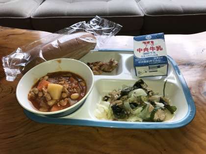 クロロールパン・牛乳・とりにくのカレーやき・ポークビーンズ・かいそうサラダ(こうみじおドレッシング)今日もおいしくいただきました。