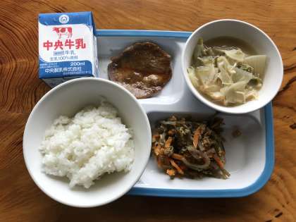 ごはん・牛乳・ぶたにくのしょうがやき・くきわかめのいりに・みだくさんじる