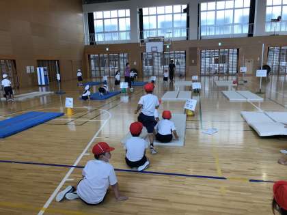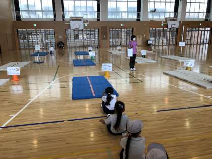マットを使った運動遊びですが,取り組む内容を図式化することでねらいを明確にし,子どもたちのやる気を引き出していました。