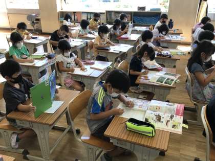 秋に関する歌について鑑賞したり,生き物調べに取り組んだりする姿が見られました。