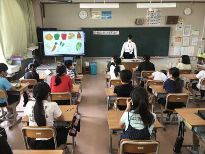 『野菜の食べ方を考えよう』をテーマに,野菜の摂取が体に及ぼす影響について理解を深めました。実習生と担任によるベジターンと太郎さんの役割演技も素敵でした。