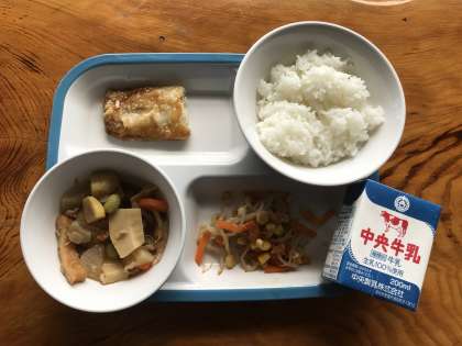 ごはん・牛乳・さんまのかばやき・くりとこんさいのにもの・もやしのごまあえ