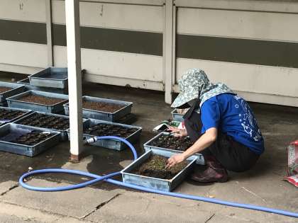 用務員さんがポットへの植え替え作業を黙々とやっていました。こういう方のお陰で,春にはきっと美しい花が咲くことでしょう。