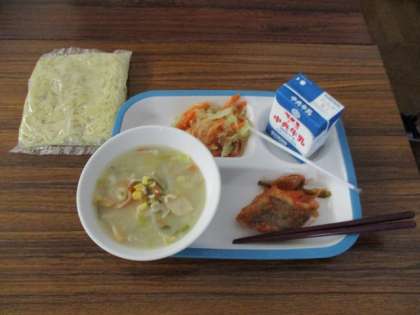 ちゅうかめん、牛乳、ちゃんぽんめん、しろみざかなのちゅうかあんかけ、バンサンスー。今日もおいしくいただきました。