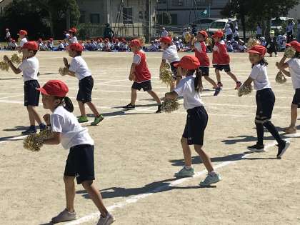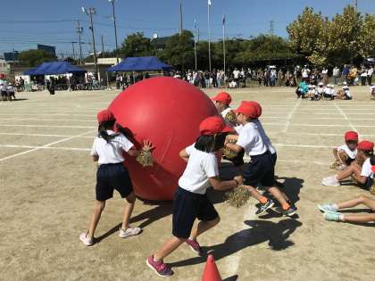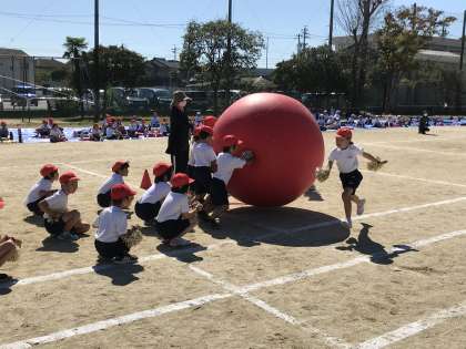 ダンスと大玉転がしの競技挑戦する赤組の様子です。