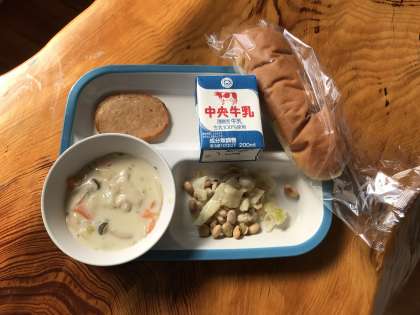 あいちのこめこパン・牛乳・きのこのクリームシチュー・ハムステーキ・まめまめサラダ(コーンクリーミードレッシング)