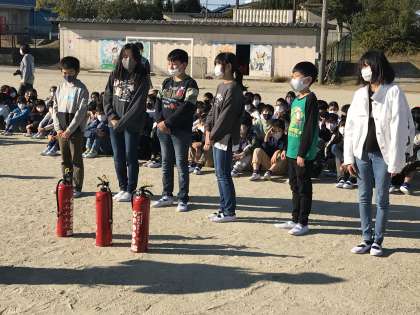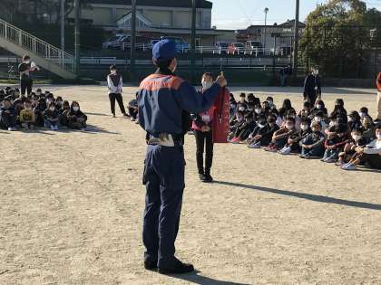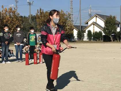 消防署の方から消火器の使い方について説明を聞き,まずは,お手本として寺田先生が活躍していました。