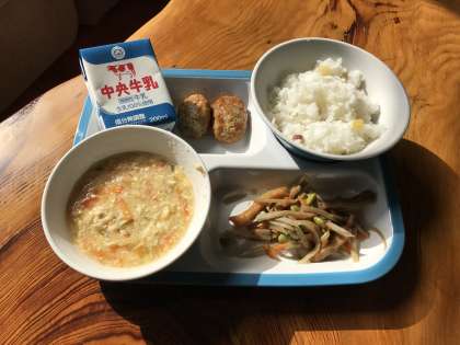 あいちのさつまいもごはん・牛乳・レバーいりしろごまつくね(2個)・きんぴらごぼう・かきたまじる