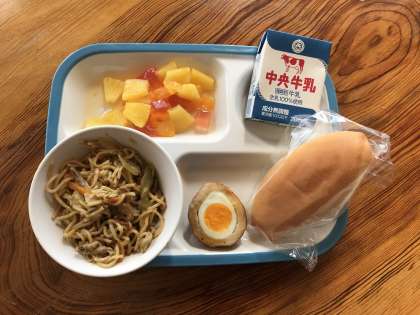 こがたロールパン・牛乳・やきそば・スコッチエッグ・フルーツのいちごゼリーあえ