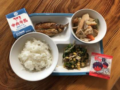 ごはん・牛乳・いわしのかばやき・こんさいに・なばなのあえもの・せつぶんまめ