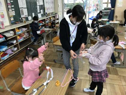 6年生を送る会に向けて踊りの練習をしたり,折り紙でメダルを作ったりする様子が見られました。また,図工の「ひらひらゆれて」では,それぞれのアイデアを生かした作品作りに取り組んでいました。