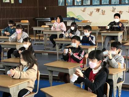 活動制限のある中,紙コップを活用したリズム打ちに取り組む様子です。小山先生の工夫を凝らした取り組みの一つです。