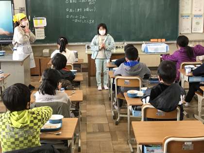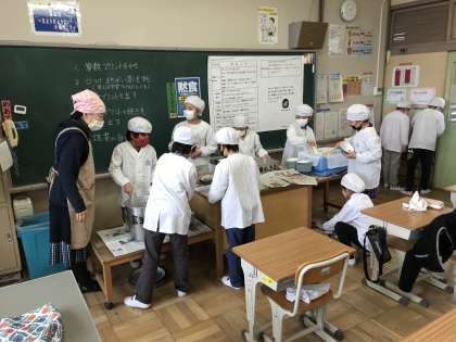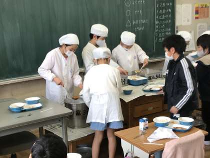 当番を中心に配膳する様子です。準備が整ったら挨拶をして黙食のスタートです。