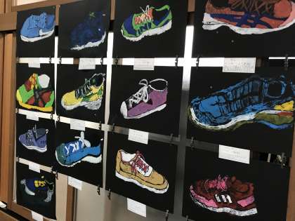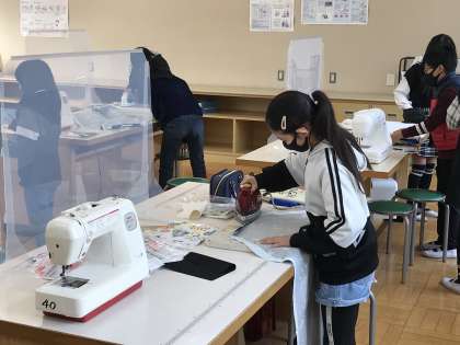 エプロン作りに取り組んだり,友達の版画作品の良さを見つけたりする様子です。