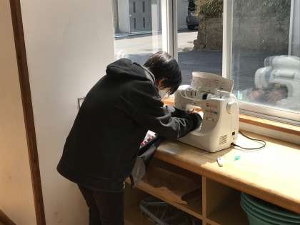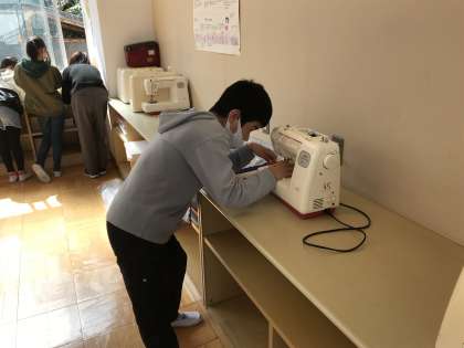 ミシンを使ってエプロンを作る様子です。真剣な眼差しが素敵です。