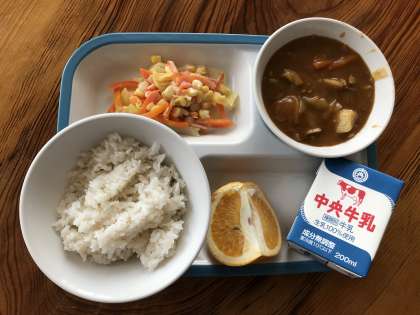 むぎごはん・牛乳・カレーライス・キャロットサラダ(コーンクリーミードレッシング)・はっさく