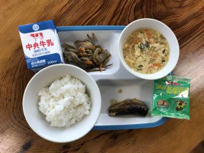 ごはん・牛乳・いわしのうめに・きんぴらごぼう・かきたまじる・とうふスナック
