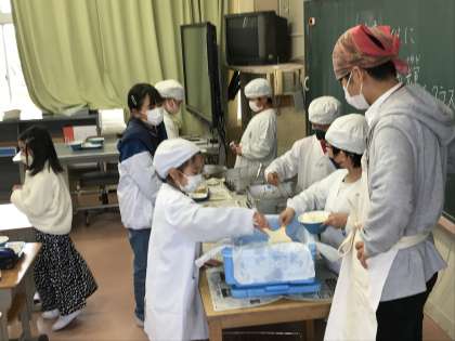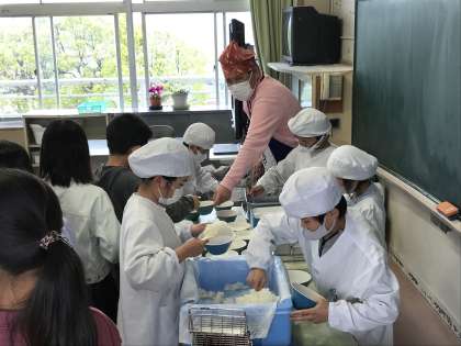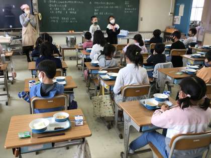 当番を中心に準備を進める様子です。また,日直の号令でいただきますをする様子も見られました。